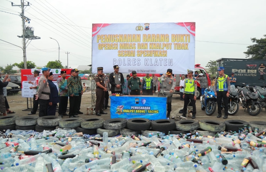 KLATEN – Polres Klaten bersama jajaran Forum Koordinasi Pimpinan Daerah (Forkopimda) Kabupaten Klaten memusnahkan ribuan botol minuman keras dan ratusan knalpot tidak sesuai spesifikasi sebagai hasil operasi penanggulangan penyakit masyarakat menjelang Ramadan. Kegiatan ini digelar sebagai bentuk komitmen bersama dalam menjaga ketertiban dan kekhusyukan ibadah masyarakat, Kamis (19/2/2026).
