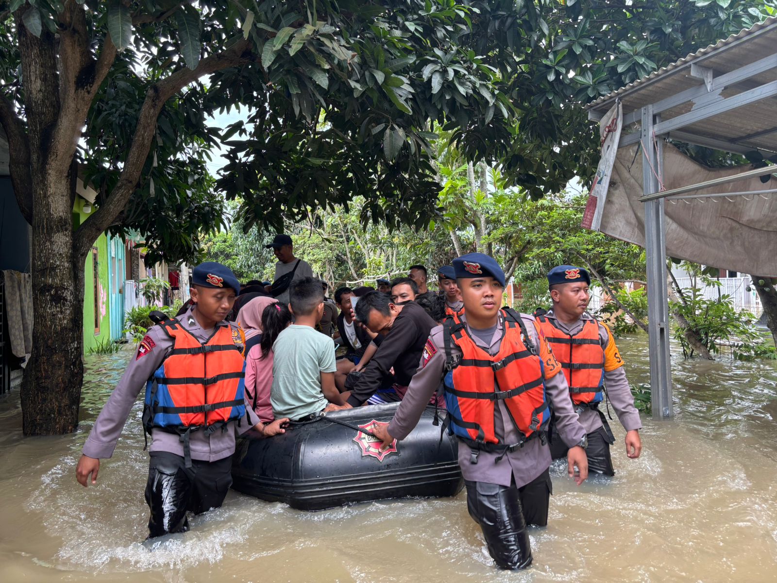 Evakuasi dilakukan menggunakan perahu karet oleh tim SAR Satbrimob Polda Banten bersama unsur terkait.