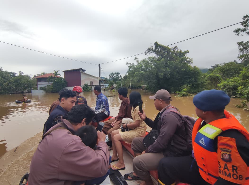 Satbrimob Polda Kalbar bersama dengan Basarnas Kabupaten Sintang melaksanakan evakuasi terhadap masyarakat yang terdampak bencana alam banjir di salah satu kabupaten Di Provinsi Kalbar. Sabtu (10/01/26).