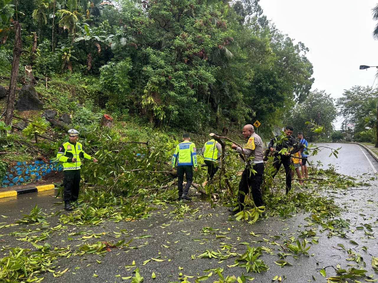 AKBP Marthin W. Asmuruf menjelaskan bahwa pihaknya menerima laporan adanya pohon tumbang akibat cuaca hujan deras yang berpotensi membahayakan pengguna jalan. Menindaklanjuti laporan tersebut, personel langsung dikerahkan ke lokasi untuk melakukan penanganan secara cepat dan terkoordinasi.