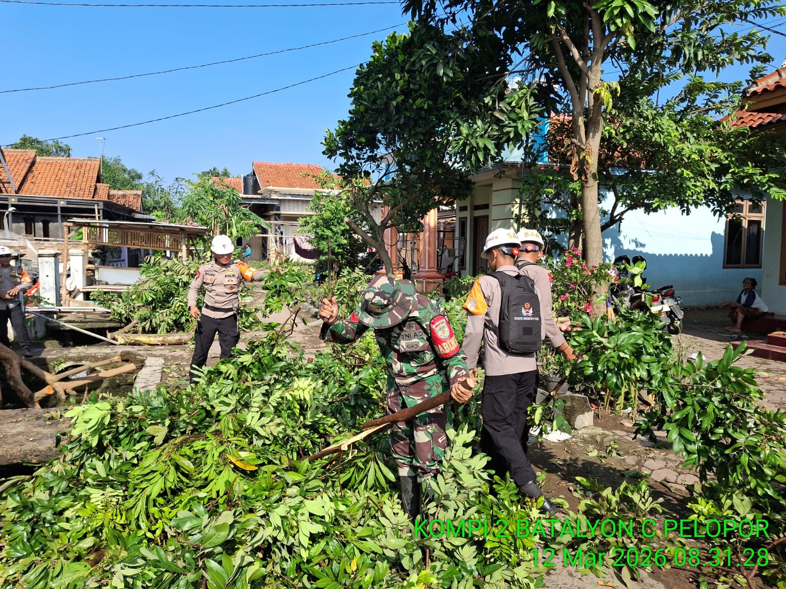 Memasuki pukul 09.15 WIB, Tim SAR Brimob bersama personel TNI dan anggota Polres Cirebon Kota mulai melaksanakan kegiatan pembersihan di sejumlah titik terdampak. Personel bahu-membahu membersihkan pohon tumbang, puing-puing bangunan, serta membantu warga yang rumahnya mengalami kerusakan akibat terjangan angin puting beliung.