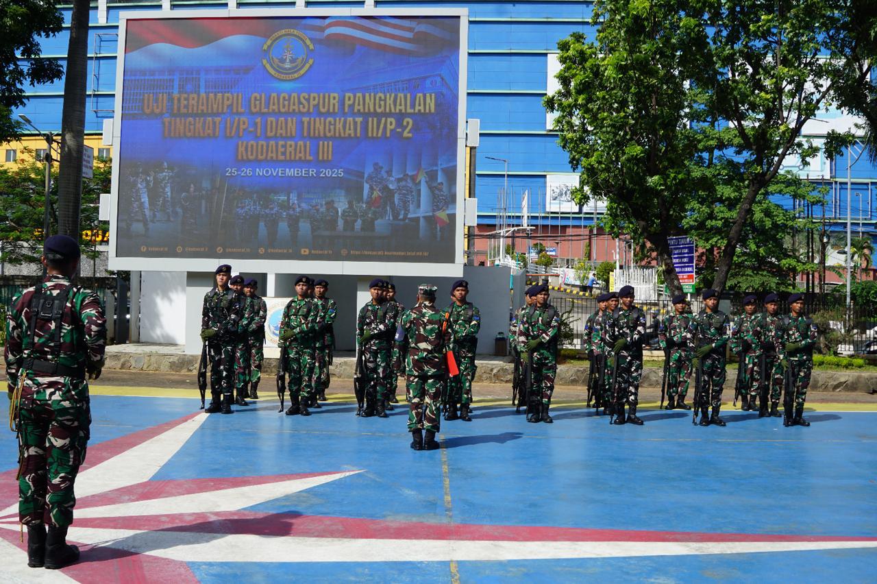 Komandan Komando Daerah Angkatan Laut (Dankodaeral) III, Laksda TNI Uki Prasetia, S.T., M.M. yang diwakili oleh Asops Dankodaeral III, Kolonel Laut (P) Yovan Ardiyanto Yusuf, S.E., M.Tr.Opsla., CHRMP., hari ini resmi membuka Uji Terampil Gladi Latihan Tempur (Glagaspur) Pangkalan P1 dan P2 Tahun 2025. Upacara pembukaan ini berlangsung di Rupat Besar Markas Komando Kodaeral III, Jakarta Utara, Selasa (25/11).