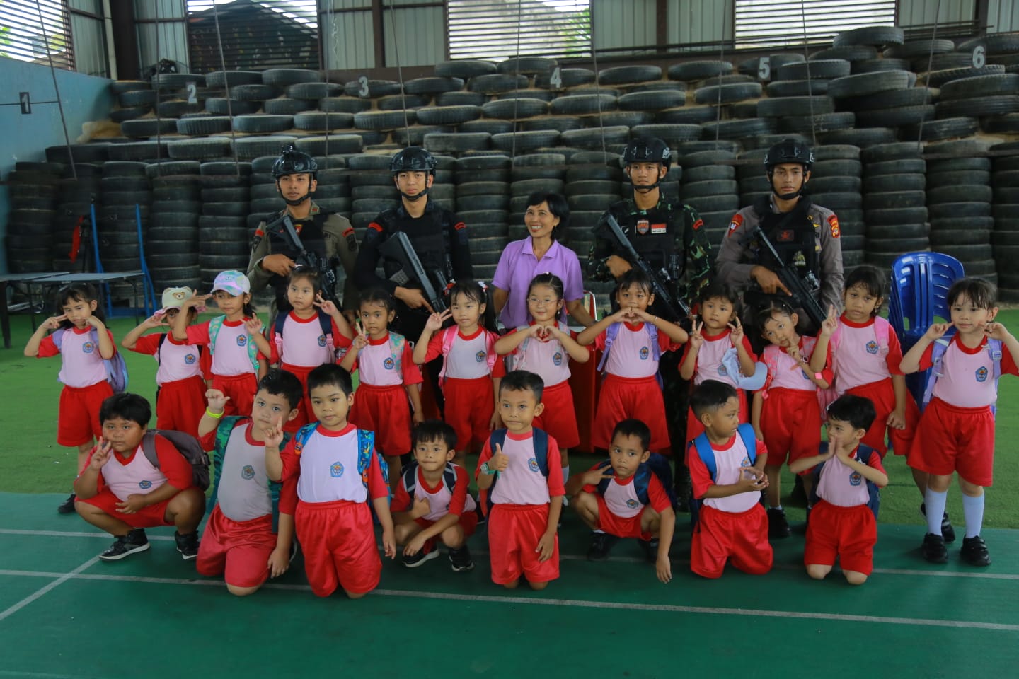 Personel Brimob dengan ramah membimbing para siswa, memberikan penjelasan sederhana, serta menghadirkan permainan edukatif dan simulasi ringan agar mudah dipahami oleh anak-anak. Suasana penuh tawa dan rasa ingin tahu terlihat sepanjang kegiatan berlangsung.