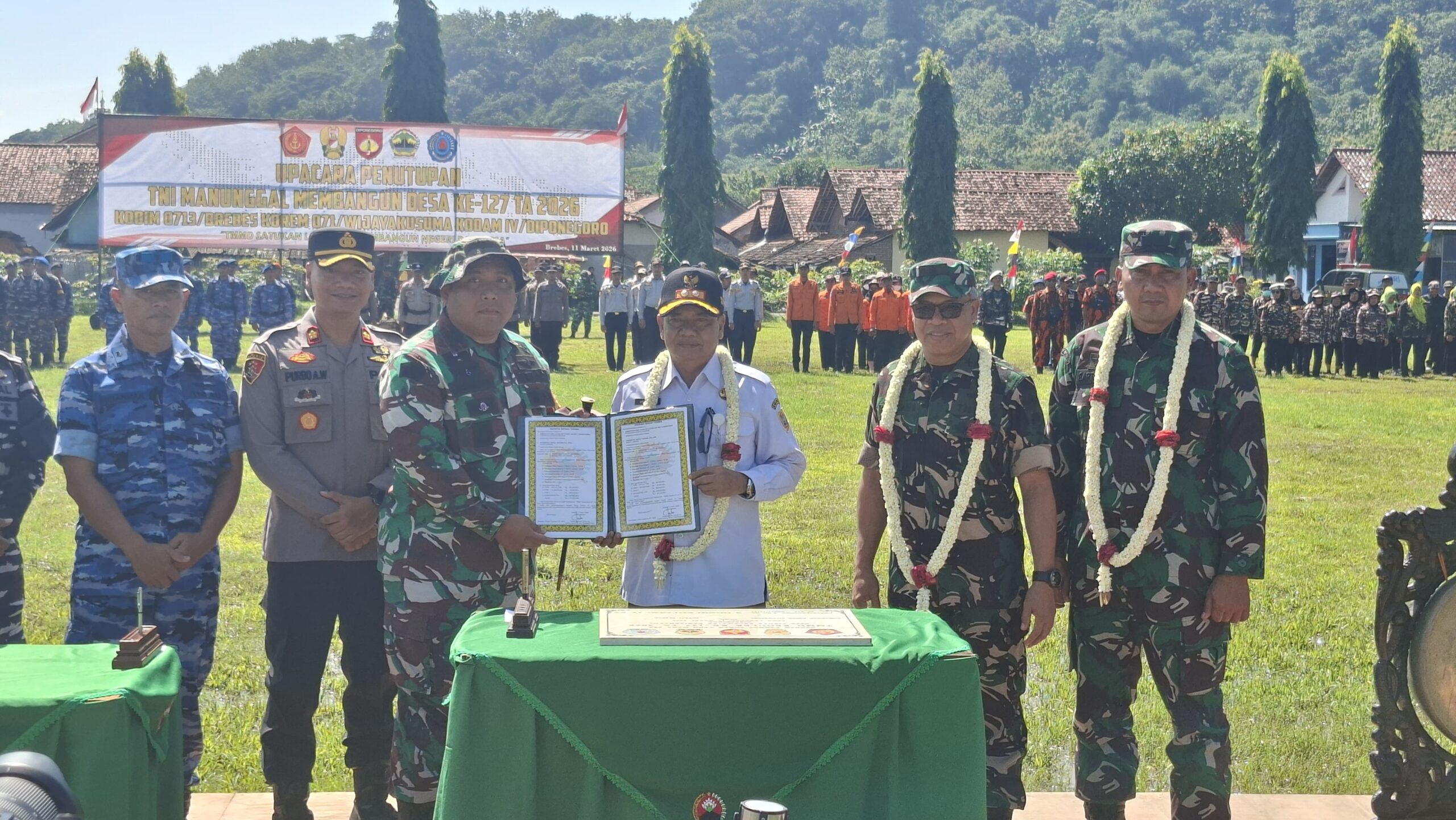 ​BREBES – Sebuah babak baru bagi akselerasi pembangunan di wilayah Kabupaten Brebes bagian selatan resmi dimulai. Program TNI Manunggal Membangun Desa (TMMD) Reguler ke-127 tahun anggaran 2026 yang dipusatkan di Desa Cikuya, Kecamatan Banjarharjo, dinyatakan selesai dengan capaian sempurna 100 persen. Penutupan program kolosal ini ditandai dengan upacara khidmat yang dipimpin oleh Kapok Sahli Pangdam IV/Diponegoro, Brigjen TNI Abdul Hanis, S.I.P., M.Si., CGRA, mewakili Pangdam IV/Diponegoro, Rabu (11/3/2026).