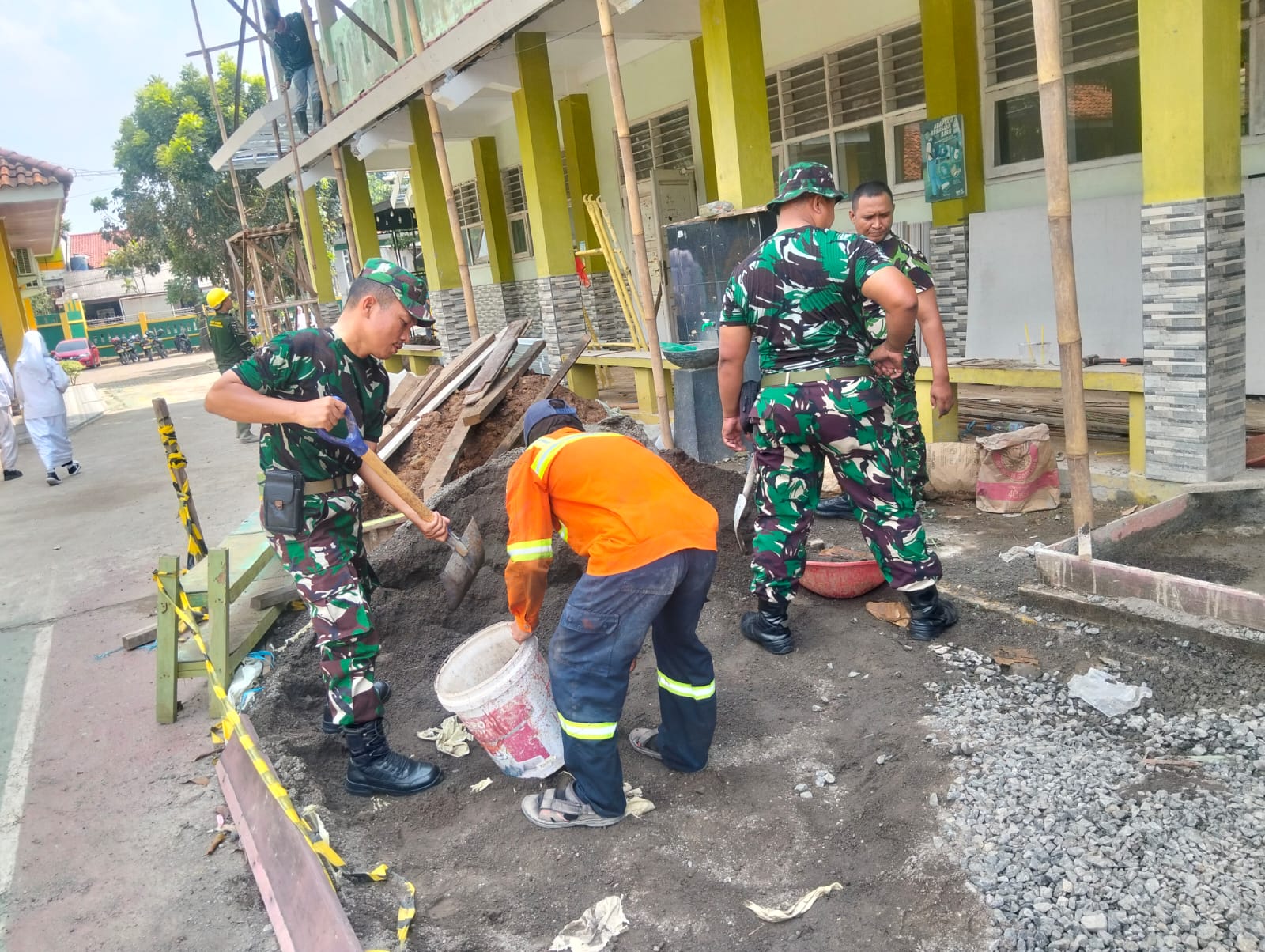 Personel Babinsa terlihat bekerja bahu-membahu bersama para pekerja dan warga sekitar. Mereka membantu berbagai pekerjaan fisik seperti pemasangan plafon, pengacian di bawah rangka WF lantai satu, pembuatan tangga untuk akses pengacian, serta menaikkan pasir ke lantai dua.
