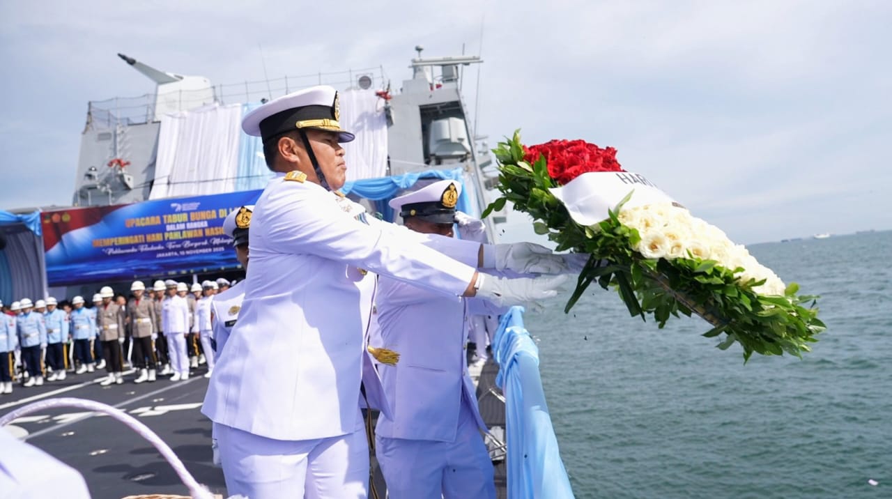 Komandan Sekolah Staf dan Komando Angkatan Laut (Danseskoal) Laksamana Muda TNI Ariantyo Condrowibowo diwakili Wakil Komandan (Wadan) Seskoal Laksamana Pertama TNI Dr. Ferry Supriady, S.T., M.M., M.Tr.Opsla., CIQaR.. mengikuti upacara tabur bunga di laut dalam rangka memperingati Hari Pahlawan tahun 2025, dengan Inspektur Upacara Kepala Staf Angkatan Laut (Kasal) Laksamana TNI Dr. Mohammad Ali, S.E., M.M., M.Tr.Opsla., bertempat di geladak KRI Brawijaya 320 yang berlayar dari Dermaga Tanjung Priok menuju perairan Teluk Jakarta, Senin (10/11/2025).