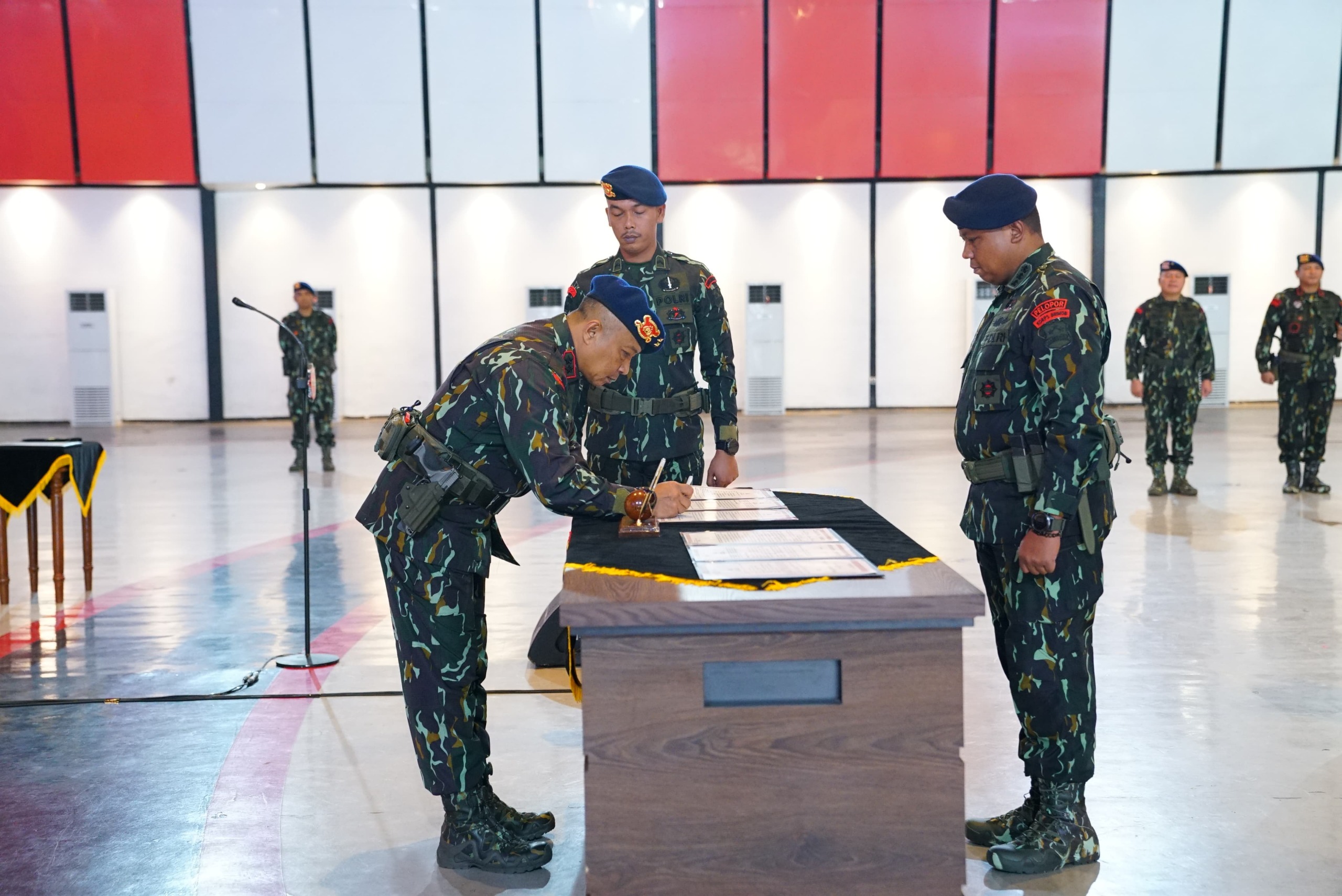 Wakil Komandan Korps Brimob Polri Irjen Pol. Ramdani Hidayat Memimpin Upacara Serah Terima Jabatan (Sertijab) Kabid TIK Korbrimob Polri Dan Kabid Kesjas Korbrimob Polri di Gedung Satya Haprabu Mako Korbrimob Polri Kelapadua, Cimanggis, Kota Depok. Selasa (18/3/2025).