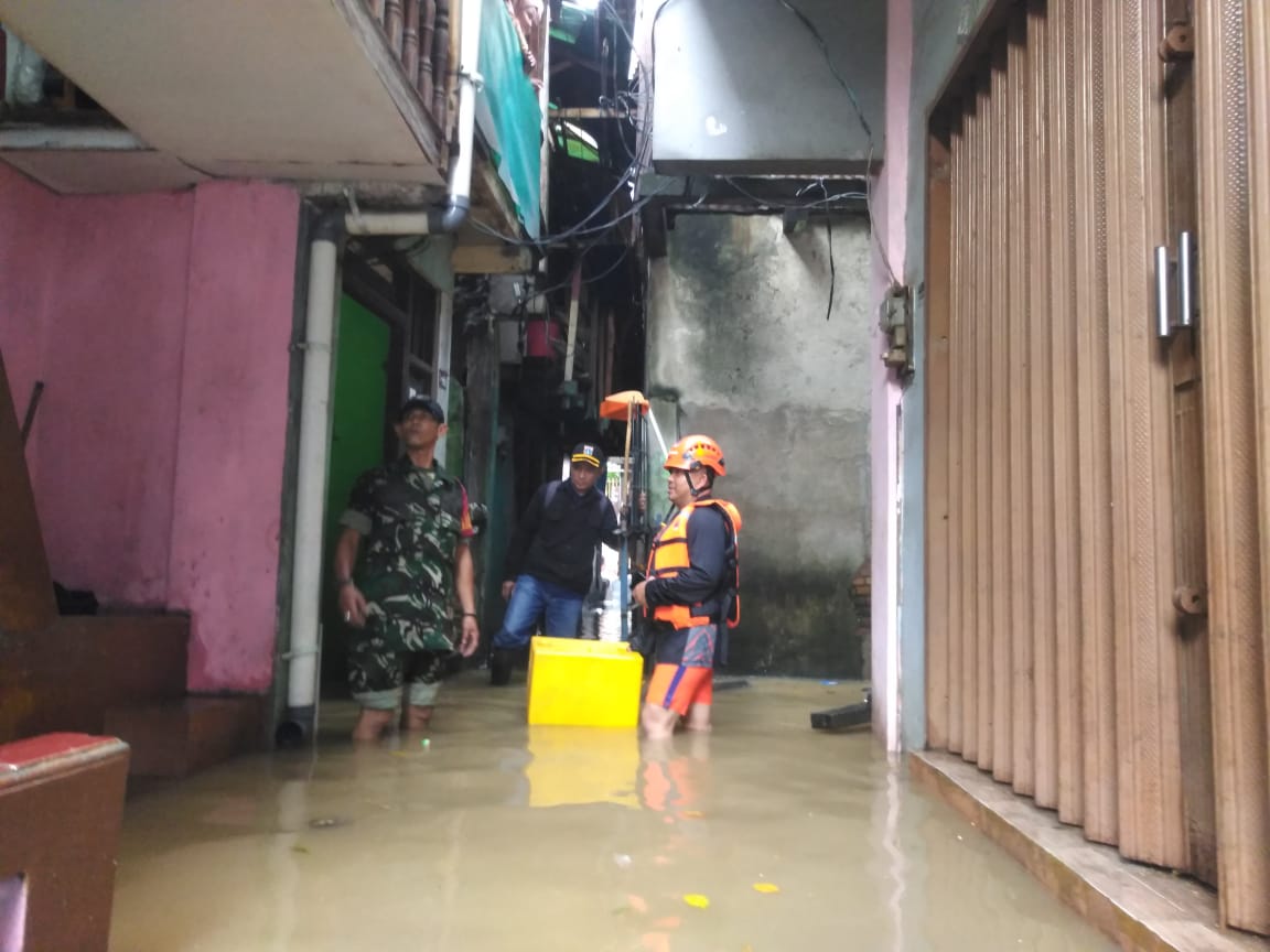 Tanah Abang_Hujan deras yang mengguyur wilayah Jakarta sejak siang hari menyebabkan peningkatan debit air di anak Kali Krukut, yang akhirnya meluap dan menggenangi beberapa titik di Kelurahan Karet Tengsin, Kecamatan Tanah Abang. Menyikapi kondisi tersebut, Wadanramil 05/Tanah Abang, Lettu Cke Andi Fausir, langsung turun ke lokasi untuk mengecek situasi serta memastikan langkah-langkah penanganan yang diperlukan. Selasa (4/3/2024)