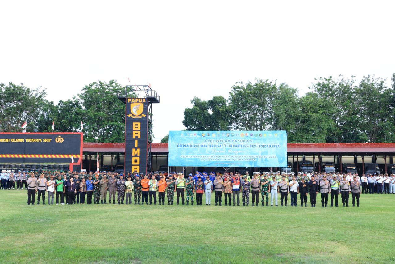 Jayapura – Wakil Kepala Kepolisian Daerah Papua, Brigjen Pol. Dr. Faizal Ramadhani, S.Sos., S.I.K., M.H., memimpin Apel Gelar Pasukan Operasi Kepolisian Terpusat Lilin Cartenz-2025 dalam rangka pengamanan perayaan Natal 2025 dan Tahun Baru 2026 di wilayah hukum Polda Papua.
